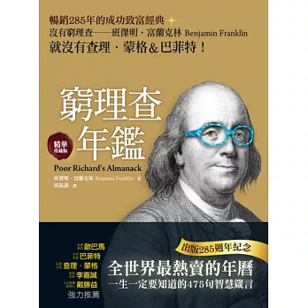 股神巴菲特的50年智慧盟友──查理‧蒙格說:「富蘭克林的格言比商學院學到的東西有益得多。」事實上,不只查理‧蒙格奉富蘭克林為人生導師,華倫‧巴菲特也深受其影響,他的推薦書單就有《窮理查年鑑》;連世稱「巴菲特最忠實信徒」的印度投資高手莫尼斯‧帕伯萊也認為,《窮理查年鑑》裡的〈財富之路〉是投資理財必讀的經典!