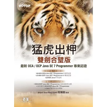 猛虎出柙雙劍合璧版:最新 OCA / OCP Java SE 7 Programmer 專業認證購買網址:http://www.books.com.tw/exep/assp.php/87926/products/0010587319?utm_source=87926&utm_medium=ap-books&utm_content=recommend&utm_campaign=ap-201610